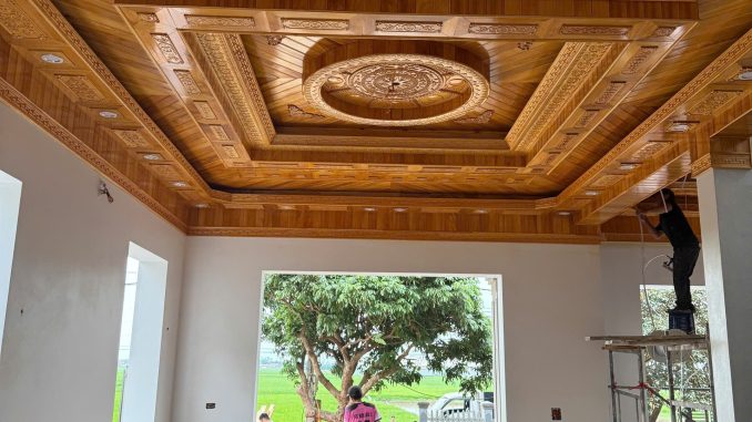 Toàn bộ công trình được thiết kế theo kiểu trần gỗ giật 3 cấp, giúp tạo chiều sâu cho không gian và mang lại cảm giác sang trọng, bề thế hơn cho ngôi nhà. Các tấm gỗ được lựa chọn kỹ lưỡng, xử lý đồng đều về màu sắc và vân gỗ, đảm bảo khi lắp đặt tạo thành một tổng thể hài hòa. Hệ thống mạch gỗ được thi công thẳng hàng, liền mạch, kết hợp cùng bề mặt được xử lý nhẵn mịn, mang lại độ hoàn thiện cao và tính thẩm mỹ nổi bật.