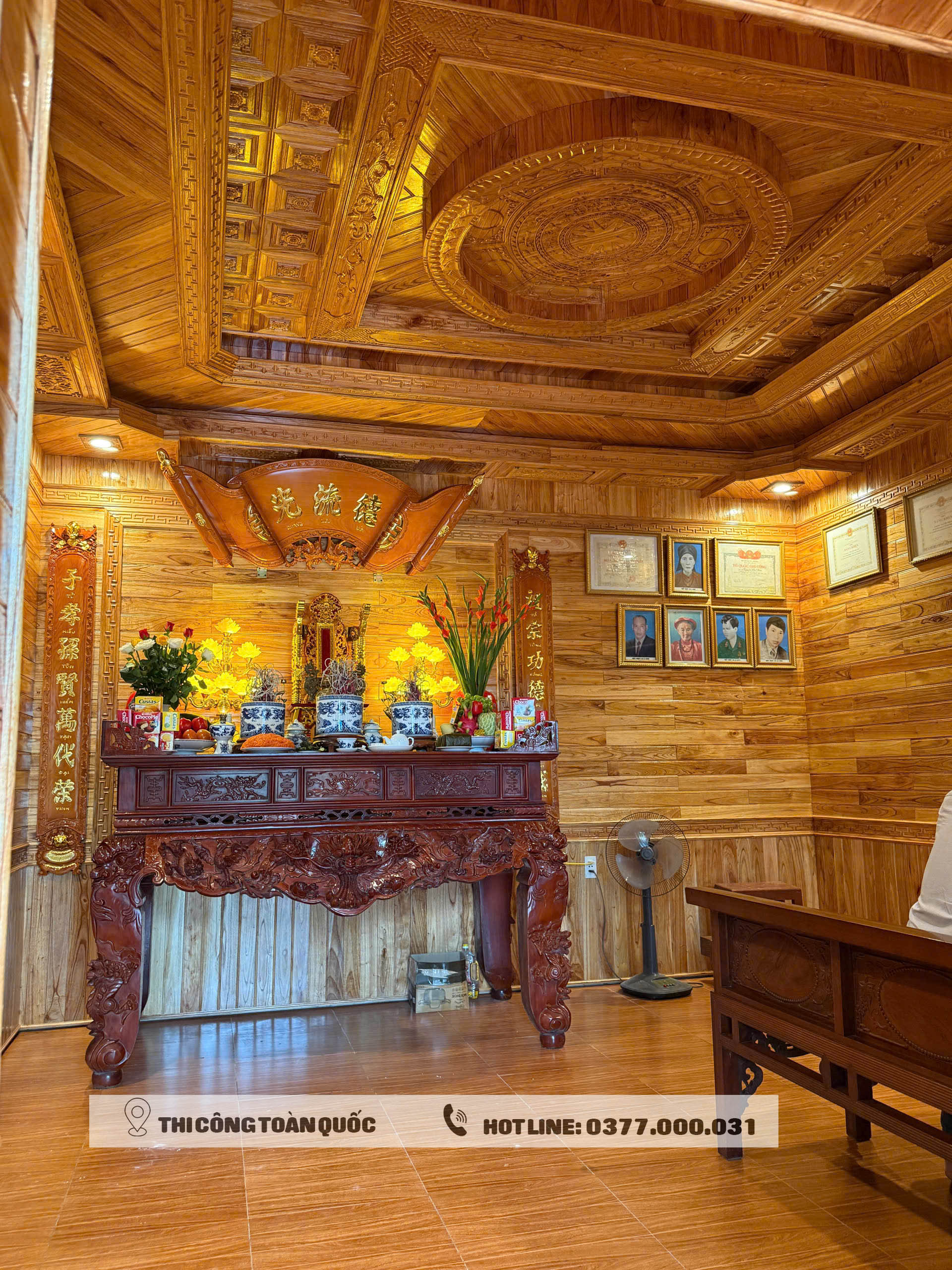 Chính vì vậy, nhiều gia đình lựa chọn trần gỗ xoan để tạo điểm nhấn cho phòng khách, phòng thờ hoặc toàn bộ tầng 1.